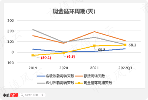 公司现金循环周期天数自2019年起不断上行,但2022年前三季度仅为68天,基本没压力。
