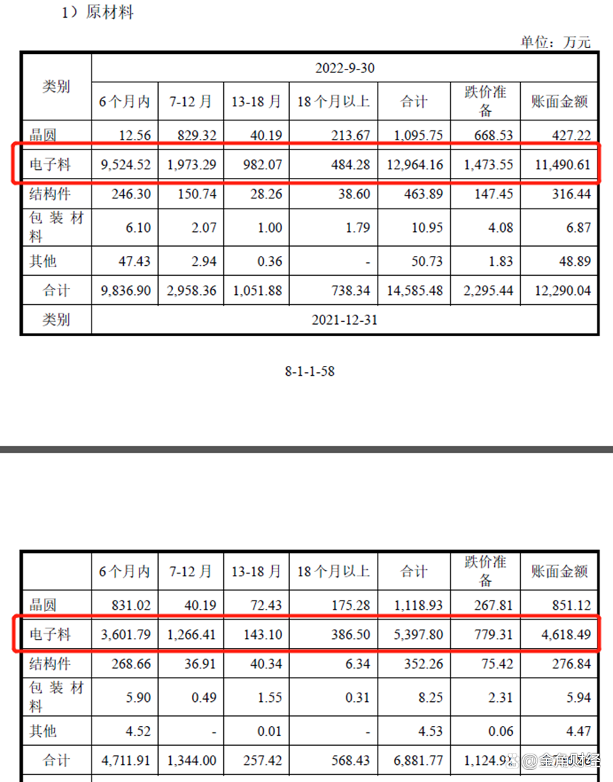 具体来看,首先是原材料中的“电子料”增幅较大。2021年末,电子料账面金额为4618万,仅三个季度过去变为1.15亿,增幅149%。