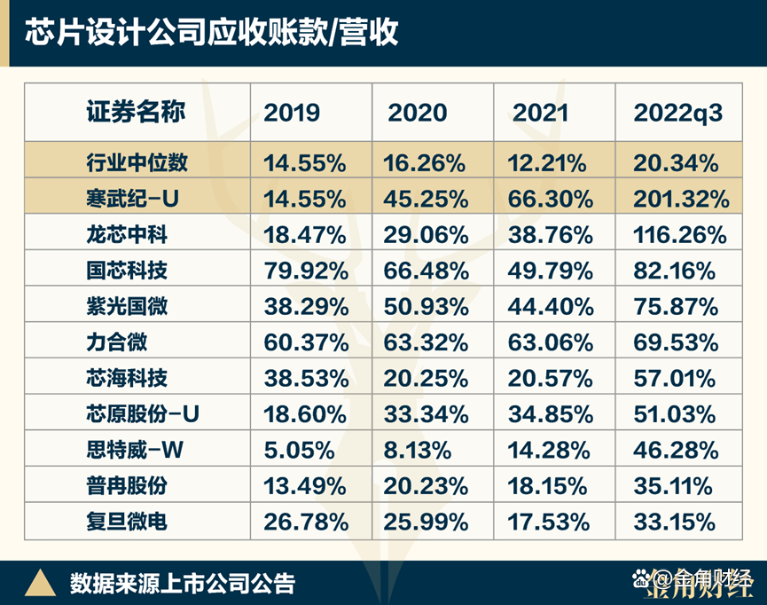 横向对比看,2019-2021年,寒武纪应收账款营收占比分别为14.55%、45.25%、66.3%,同期芯片设计行业中位数仅14.55%、16.25%、12.21%;