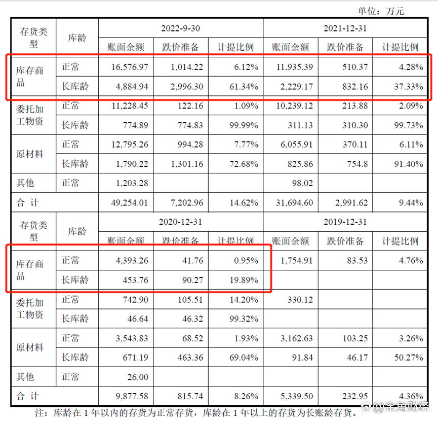 同时,长库龄库存商品占比也不断提高,2019-2021年和2022年三季度末分别为 0%、9.36%、15.74%、22.76%。