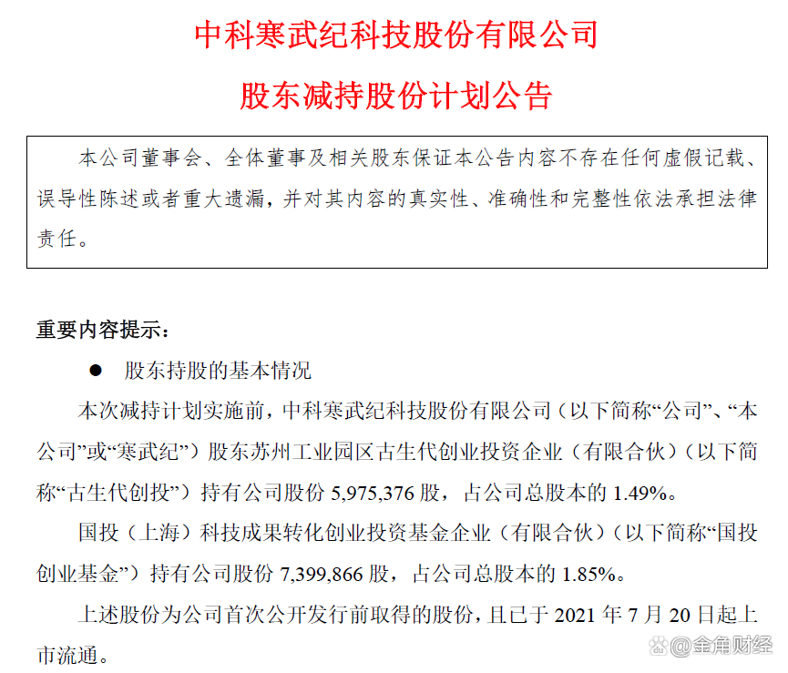 此前3月16日,寒武纪公告称,第四、五大股东国投创业基金、古生代创投计划清仓式减持。