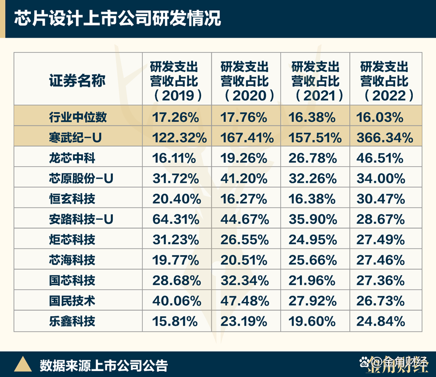 2022年上半年,寒武纪研发支出进一步提高至营收的3.66倍,该比例接近排名第二的龙芯中科8倍,同期行业中位数仅16.03%。