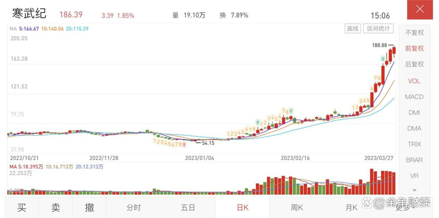 被誉为“AI芯片第一股”的寒武纪,在ChatGPT概念加持下,股价由去年末不足55元暴涨至今日收盘价186.39元,不到一个季度涨了241.6%。