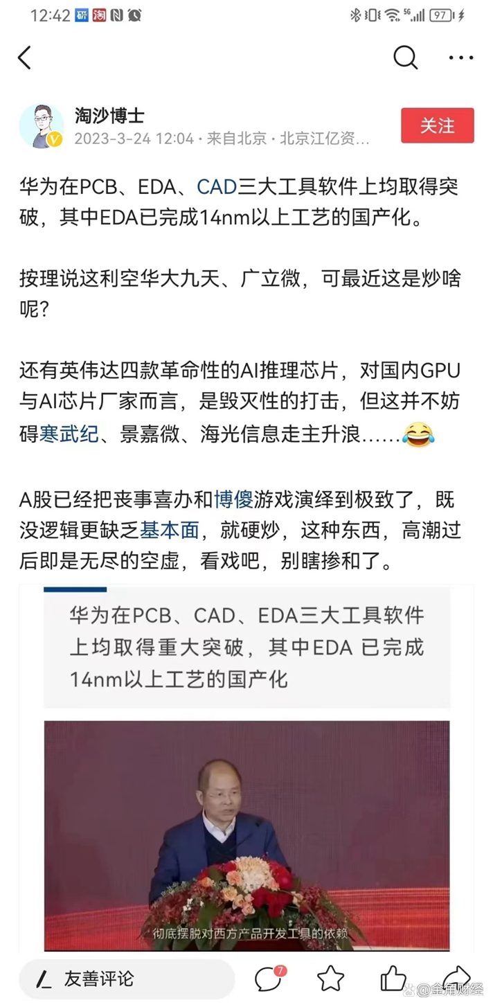 名为“淘沙博士”的博主称,华为在PCB、EDA、CAD三大工具软件上均取得突破,其中EDA已完成14nm以上工艺的国产化,还有英伟达四款革命性的AI推理芯片,对国内GPU与AI芯片厂家而言,是毁灭性的打击。