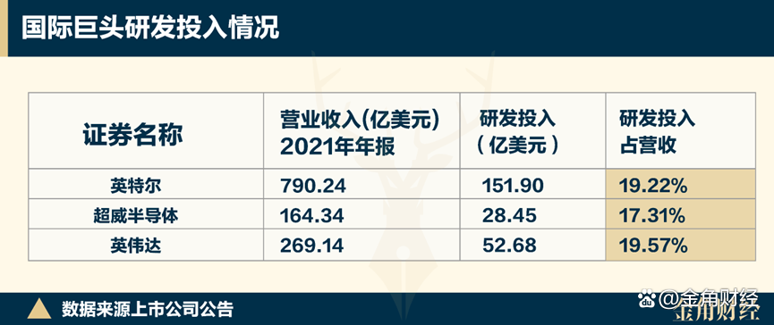 国际巨头方面,2021年财报显示,英特尔研发投入营收占比为19.22%,超威为17.31%,英伟达为19.57%。三巨头均远低于寒武纪。