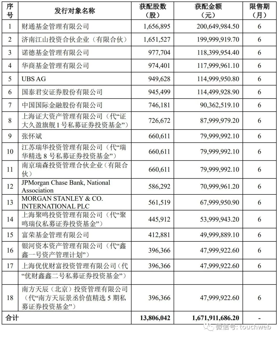 其中,财通基金管理有限公司、济南江山投资合伙企业(有限合伙)均认购2亿元,诺德基金管理有限公司认购1.18亿元,华商基金管理有限公司认购1.18亿元,UBS AG、国泰君安证券股份有限公司分别认购1.14亿元,中国国际金融股份有限公司认购9036万元。