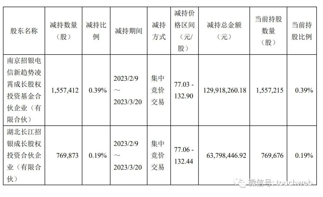 其中,南京招银在2023年2月9日至3月20日以集中竞价交易方式减持,减持均价为77.03元到132.9元,套现1.3亿元;湖北招银以77.06元到132.44元的均价减持,套现6379.8万元。