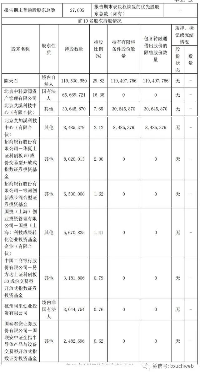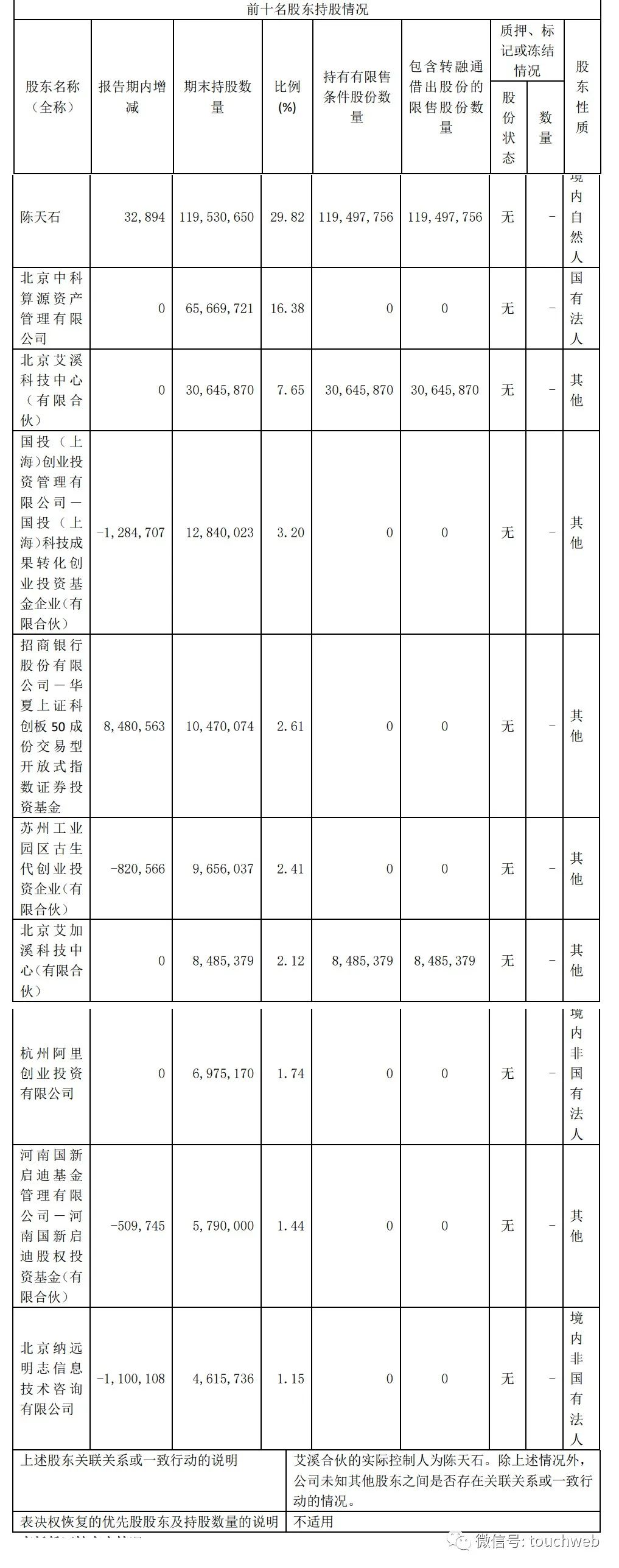 截至2023年3月31日,陈天石直接持股为29.82%,北京中科算源资产管理有限公司持股16.38%,北京艾溪科技中心(有限合伙)持股为7.65%,北京艾加溪科技中心(有限合伙)持股为2.12%;