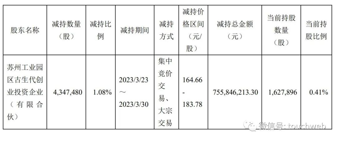 古生代创投此次减持价格区间为164.66元到183.78元,套现7.56亿元。