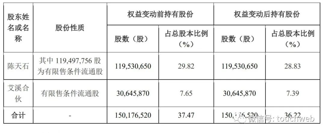 陈天石直接持股及通过作为艾溪合伙执行事务合伙人,合计拥有公司150,176,520 股的表决权,持股比例从37.47%被动稀释至36.22%。