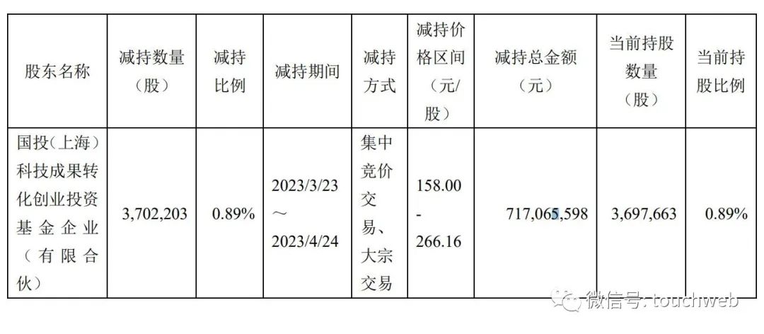 国投创业基金此次减持价格区间为158元到266.16元,套现7.17亿元。国投创业基金目前仍持股0.89%。