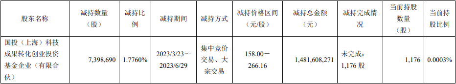 2023年9月21日,公司收到股东国投创业基金出具的《关于减持计划时间届满暨减持结果告知函》,国投创业基金已经通过大宗交易方式减持寒武纪2,185,800股股份,占目前公司总股本(416,594,451股)的0.52%,通过集中竞价方式减持寒武纪5,212,890股股份,占目前公司总股本(416,594,451股)的1.25%。国投创业基金本次减持数量7,398,690股,减持比例1.7760%,减持价格区间为158.00元/股至266.16元/股,减持总金额1,481,608,271元。