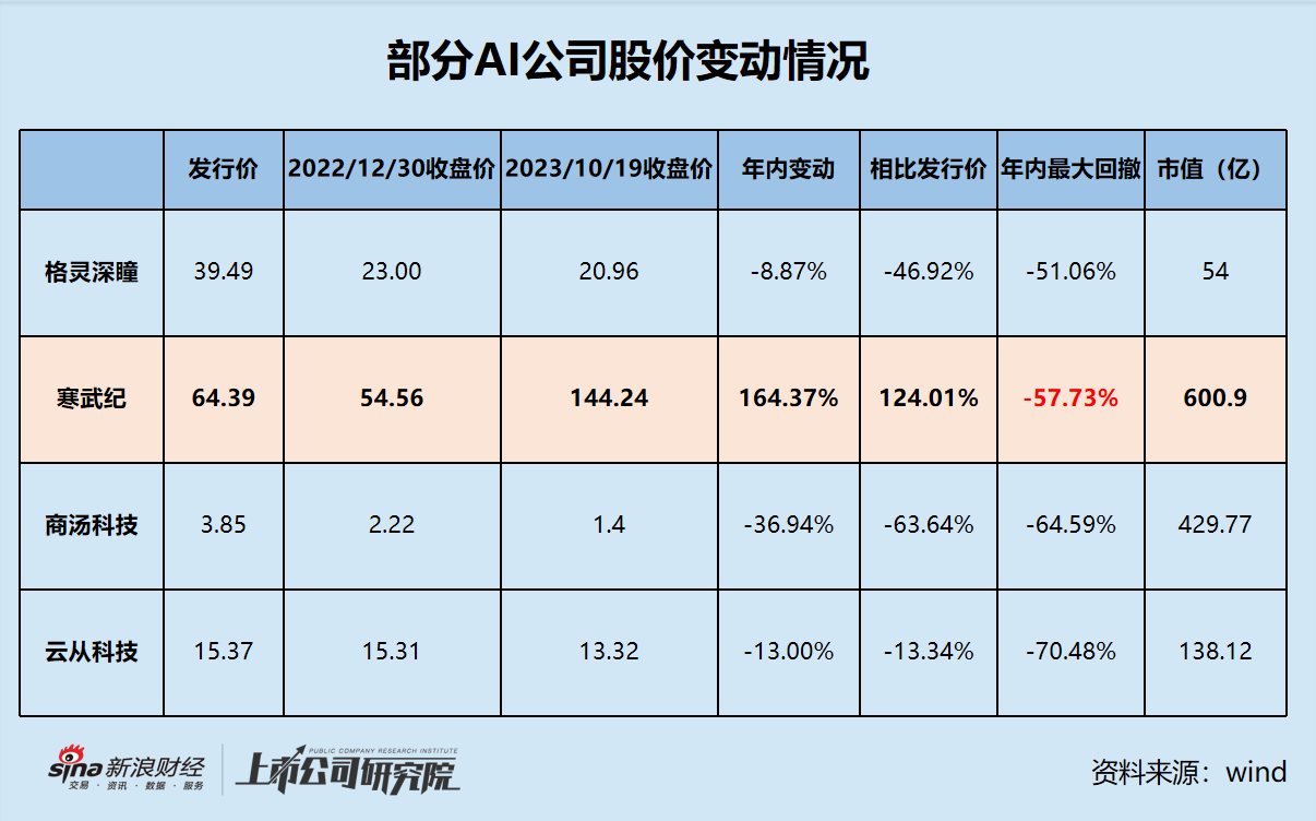 2020年7月20日,寒武纪头顶“AI芯片第一股”光环登陆科创板,发行价为64.39元,开盘大涨近290%,当日开盘价高达250元,盘中曾高达295元。但风光的日子仅仅数日,之后两年半的时候里寒武纪的股价一路跌落,直到2022年底,寒武纪的股价跌至54.56元,跌破了发行价。