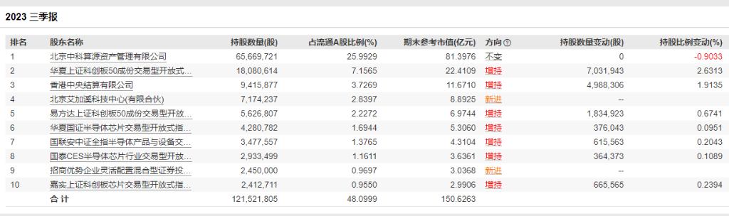 股东变化方面,三季度寒武纪获华夏、香港中央结算有限公司、易方达、国联安、嘉实等增持,北京艾加溪科技中心(有限合伙)、招商优势企业A为新进十大流通股东,社保基金420组合、银河创新成长A跌出十大流通股东名单。