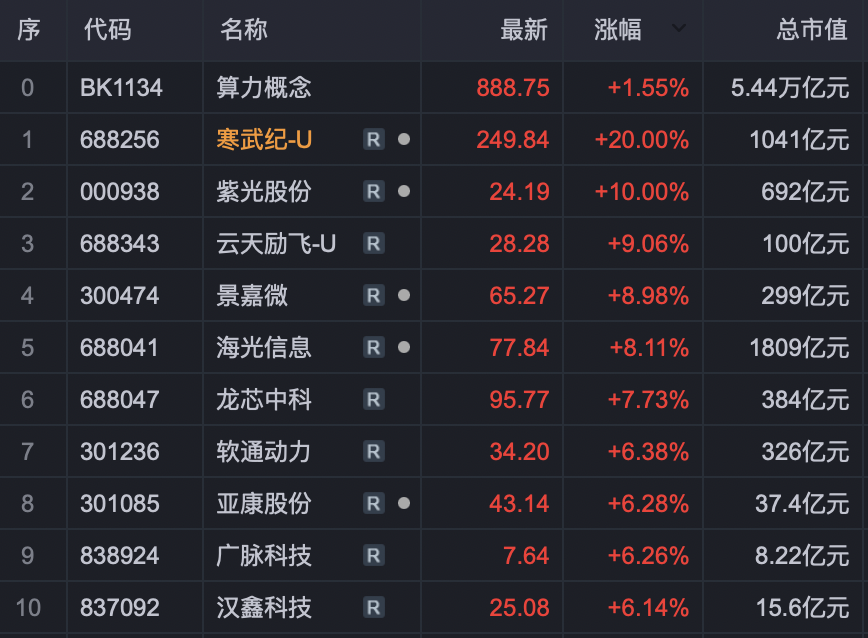 今日A股算力概念股全线爆发,寒武纪、紫光股份、景嘉微、海光信息等大涨,带动整个算力板块上涨,国证算力指数大涨3.84%。其中,寒武纪20%涨停市值重回千亿,今年以来股价涨幅已经达到85%,紫光股份10%涨停,海光信息涨8.11%,龙芯中科涨7.73%等。