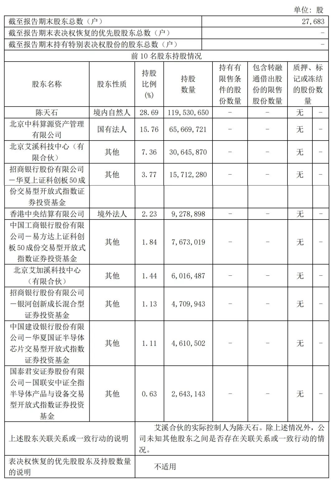 截至2024年6月30日,陈天石持股为28.69%,北京中科算源资产管理有限公司持股为15.76%,北京艾溪科技中心(有限合伙)持股为7.36%,艾溪合伙的实际控制人为陈天石。