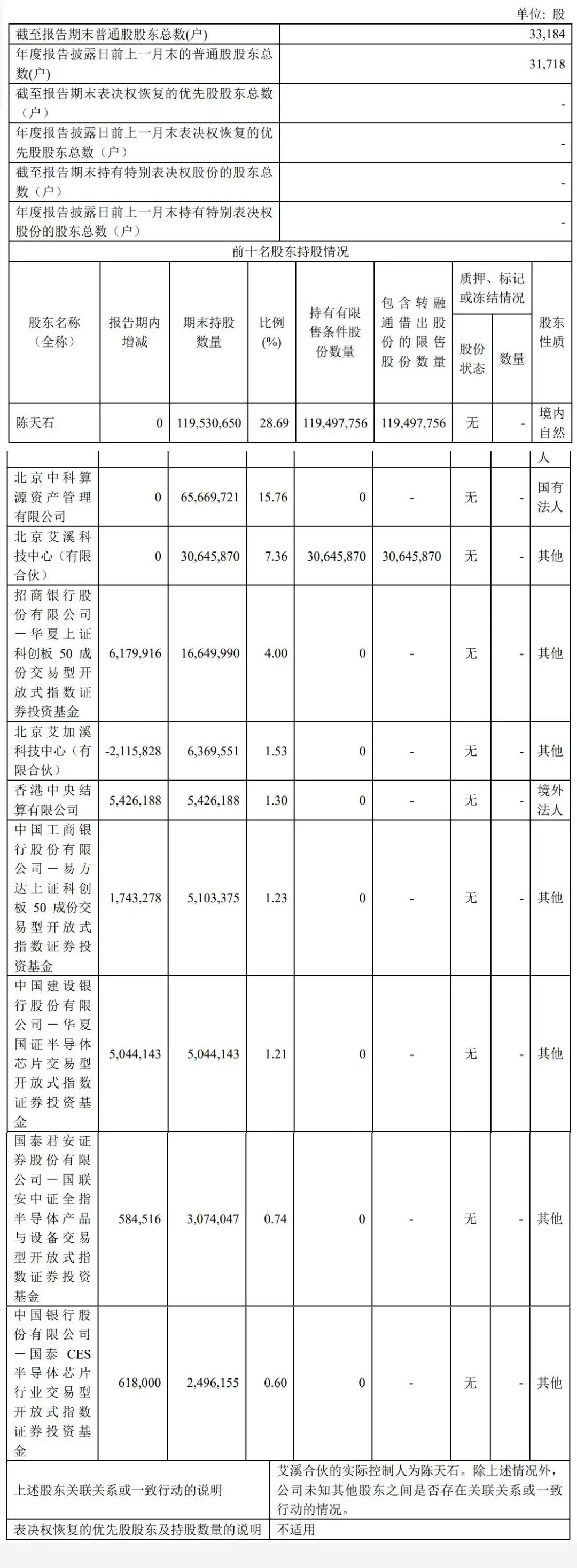 截至2023年12月31日,陈天石持股为28.69%,北京中科算源资产管理有限公司持股为15.76%,北京艾溪科技中心(有限合伙)持股为7.36%,艾溪合伙的实际控制人为陈天石。