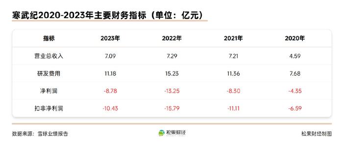 当然,因为名声在外,寒武纪的业绩表现其实也深为市场所知。上市至今,寒武纪营收规模始终维持在每年7亿元左右的水平,并连续处于亏损状态。业绩报告显示,2020年至2023年,寒武纪扣非后归母净亏损分别达到6.59亿元、11.11亿元、15.79亿元、10.43亿元。