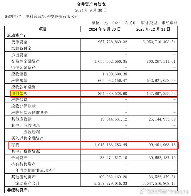 翻看财报可以发现,截至2024年前三季度,寒武纪的存货环比上半年末飙增了3倍有余,规模达10.15亿元;同期,其预付款项同步创下新高,比上年末增长54%,达8.54亿元。