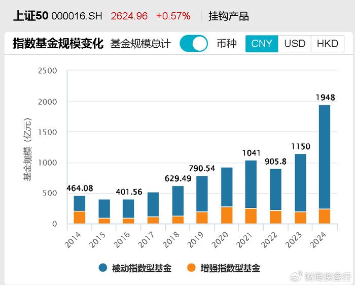 上证50指数现有跟踪基金76只,其中ETF12只,总跟踪规模1948亿元。其中,规模最大的华夏上证50ETF,总规模达到1550亿元。