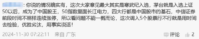 也有理性的股民指出,茅台入选上证50之后,成为A股的股王,长江电力、四大行等,更成为中国股市的基石。这次调入的股票行不行,还要用时间去检验。