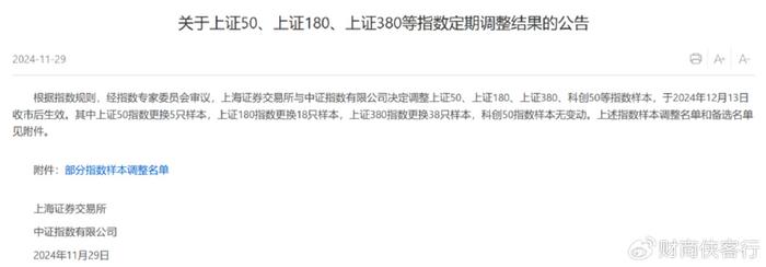 11月29日,上交所发布公告,根据指数规则,经指数专家委员会审议,上海证券交易所与中证指数有限公司决定调整上证50、上证180、上证380、科创50等指数样本,于2024年12月13日收市后生效。