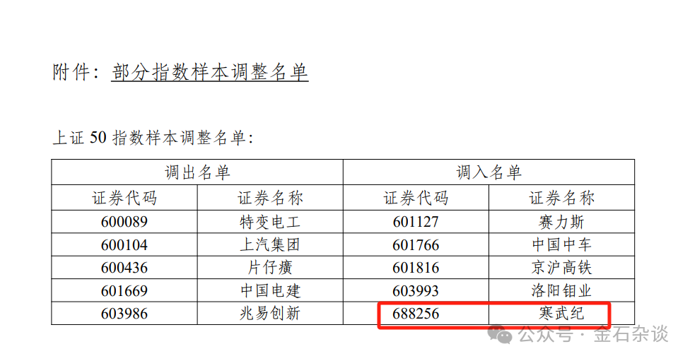 比如本次剔除的上汽集团,属于破净国企,本是国家鼓励市值管理的公司,但却被踢出上证50朋友圈;而本次纳入的寒武纪则属于股价被爆炒的典型,洛阳钼业、赛力斯等均是如此。