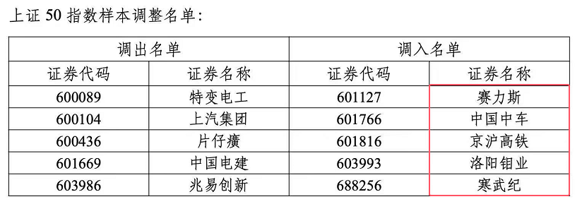 11月29日,上海证券交易所发布公告称,决定调整上证50等指数样本,新调入个股包括:赛力斯、寒武纪、洛阳钼业、中国中车、京沪高铁,调整将于2024年12月13日收市后生效。