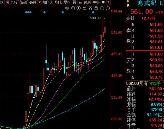 到了今年,寒武纪的市值在短短两个月内暴涨超过150%,超过了2400亿元人民币,不断刷新历史新高,成为国内芯片半导体行业上市公司中排名第三的股票,仅次于中芯国际和海光信息。