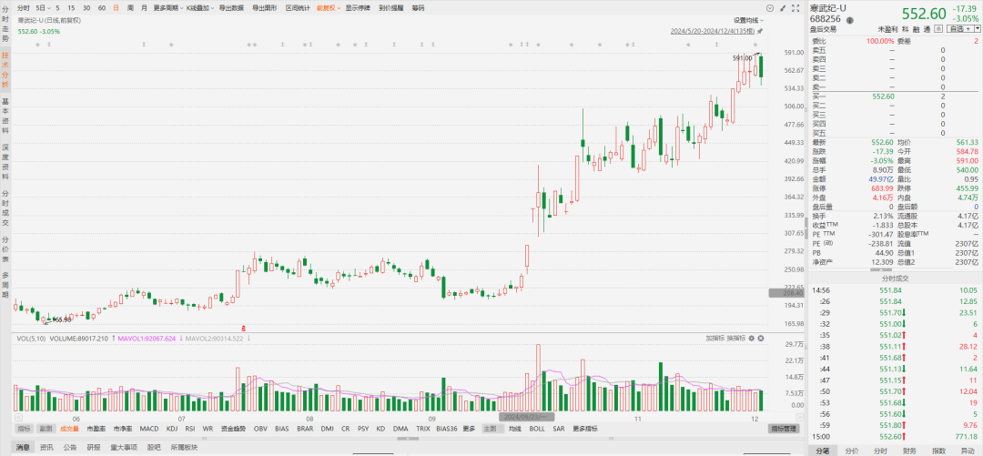 截至12月2日收盘,寒武纪报收562元,总市值达2346亿元。估值方面,公司市净率升至45.66倍,三季报的市销率高达303.78倍,即使按2023年营收计算的市销率也高达79.27倍。