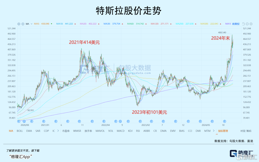 但这个月,特斯拉的股价已经超越2021年的高位,最高位是488美元。