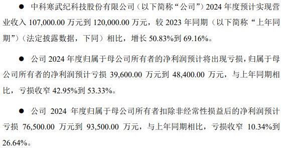 两天之前,寒武纪披露2024年年度业绩预告,根据其中数据计算,2024年第四季度,公司营业收入约为8.85亿元至10.15亿元,归属于母公司股东的净利润约为2.40亿元至3.28亿元。2023年同期,寒武纪营业收入为5.64亿元,归属于母公司股东的净利润-4071万元。