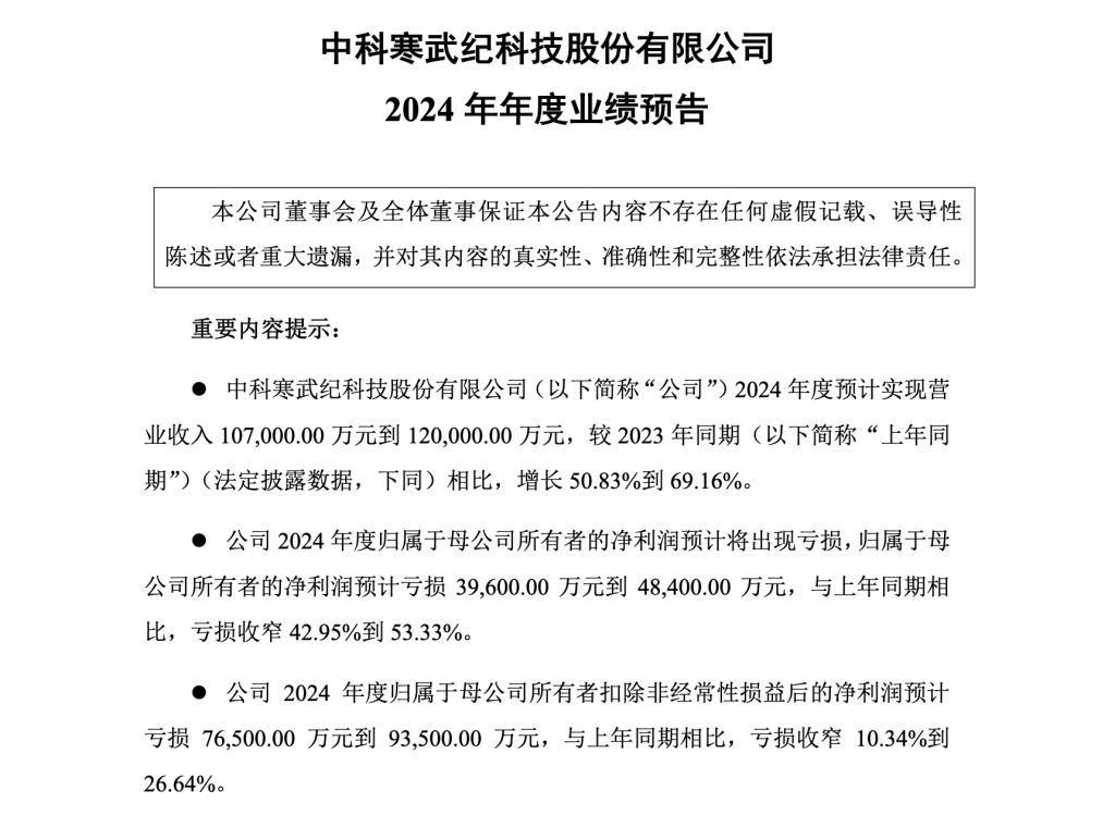 1月14日,寒武纪发布2024年度业绩预告,预计2024年实现营业收入10.7亿元到12亿元,同比增长50.83%到69.16%。公司2024年度归属于母公司所有者的净利润预计亏损3.96亿元到4.84亿元,亏损较上年同期收窄42.95%到53.33%。归属于母公司所有者的扣除非经常性损益后的净利润预计亏损7.65亿元到9.35亿元,亏损收窄10.34%到26.64%。报告期内,公司持续拓展市场,积极助力人工智能应用落地,使得收入规模较上年同期显著增长,非经常性损益对净利润的影响额预计为3.69亿元至4.51亿元。