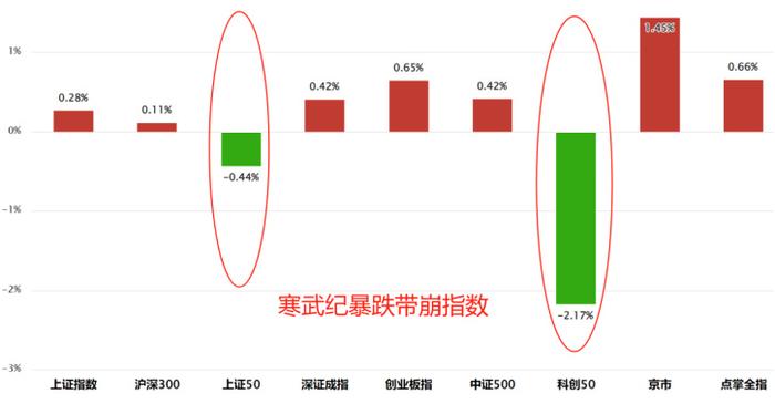 二:A股的大盘股的长期表现数据已经说明,并不适合普通人。从大盘股的指数编制的根源上看,如果都是把炒到顶部的股票加入指数,就难怪上证长期在3000点横盘。几天全市场主要指数都涨,只有受影响的和下跌,再次说明了这个问题,我们的大盘股大而不强,选择大盘股需谨慎。寒武纪科创50上证50