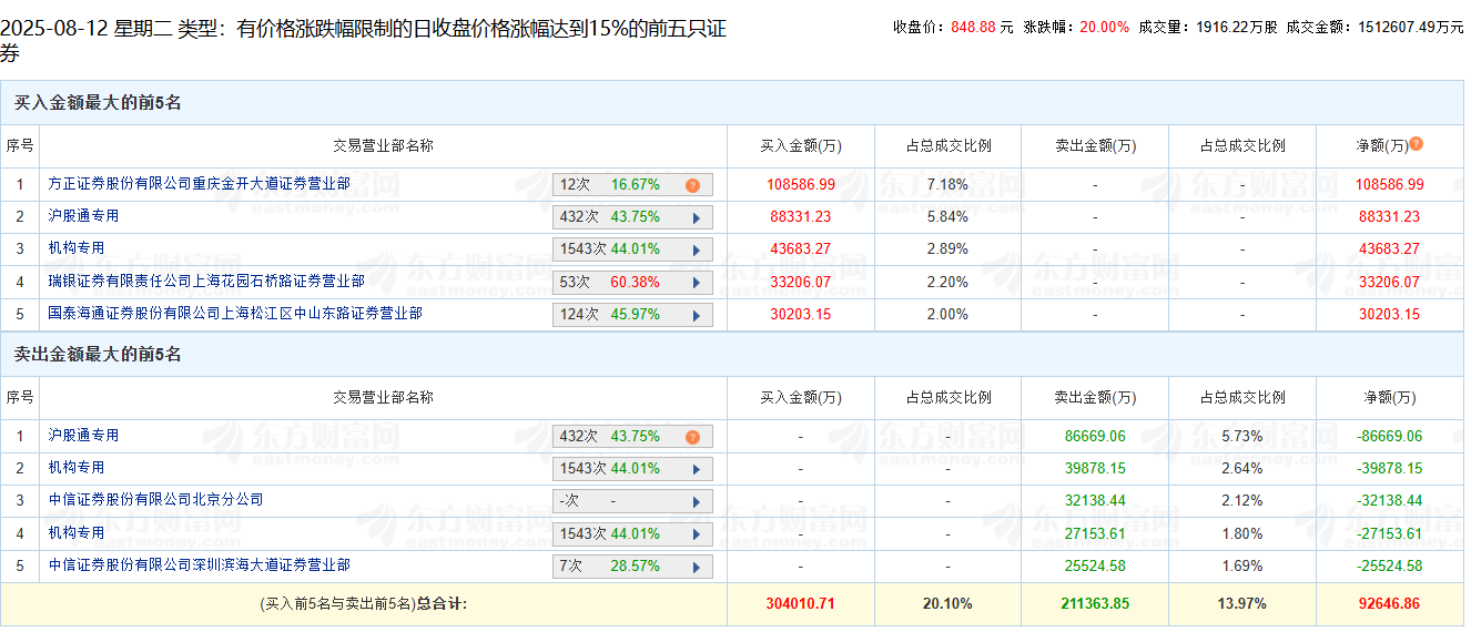 寒武纪(688256.SH)今日涨停,收报848.88元,涨幅20.00%。