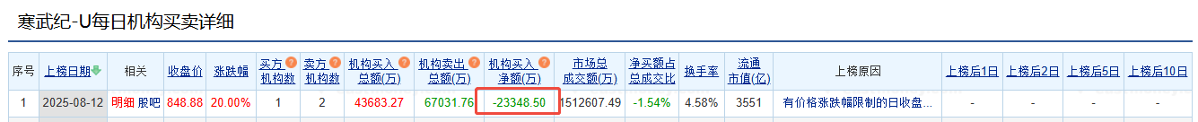 龙虎榜数据显示,寒武纪买入金额最大的前五名中,有1家机构专用席位;寒武纪卖出金额最大的前五名中,有2家机构专用席位。经统计,寒武纪的机构席位今日净卖出金额为23348.50万元。