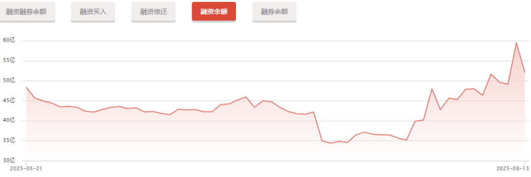 截至8月13日,其融资余额为52.14亿元,较7月中下旬时低点累计增加16.99亿元,增幅达48%。同时,8月12日融资余额达59.50亿元,创出历史最高纪录。