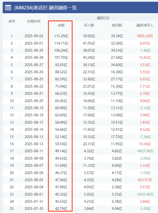 寒武纪还是当前融资买入余额最多的股票,到昨天收盘余额达到了115.29亿元,过去一个多月增速非常快。