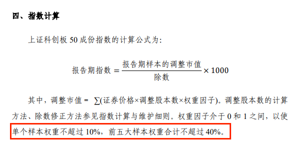 根据上交所科创板50指数编制方案,单个样本权重不能超过10%,前五大样本权重合计不超过40%。