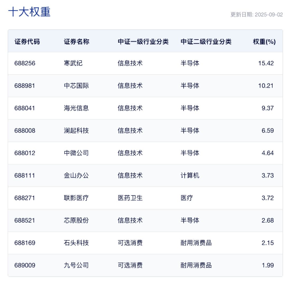 下图是截至9月2日,科创板的10大权重股,其中寒武纪权重达到了15.42%,中芯国际达到了10.21%,都超标了。