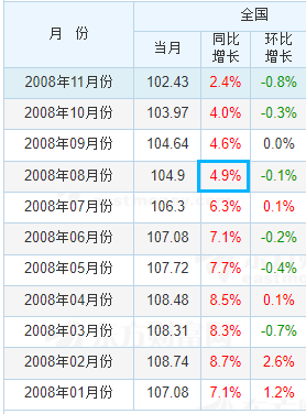 2008年8月的CPI虽然有所回落,仍然在4.9%的高位(上图)。40天后,全球金融风暴就爆发了。