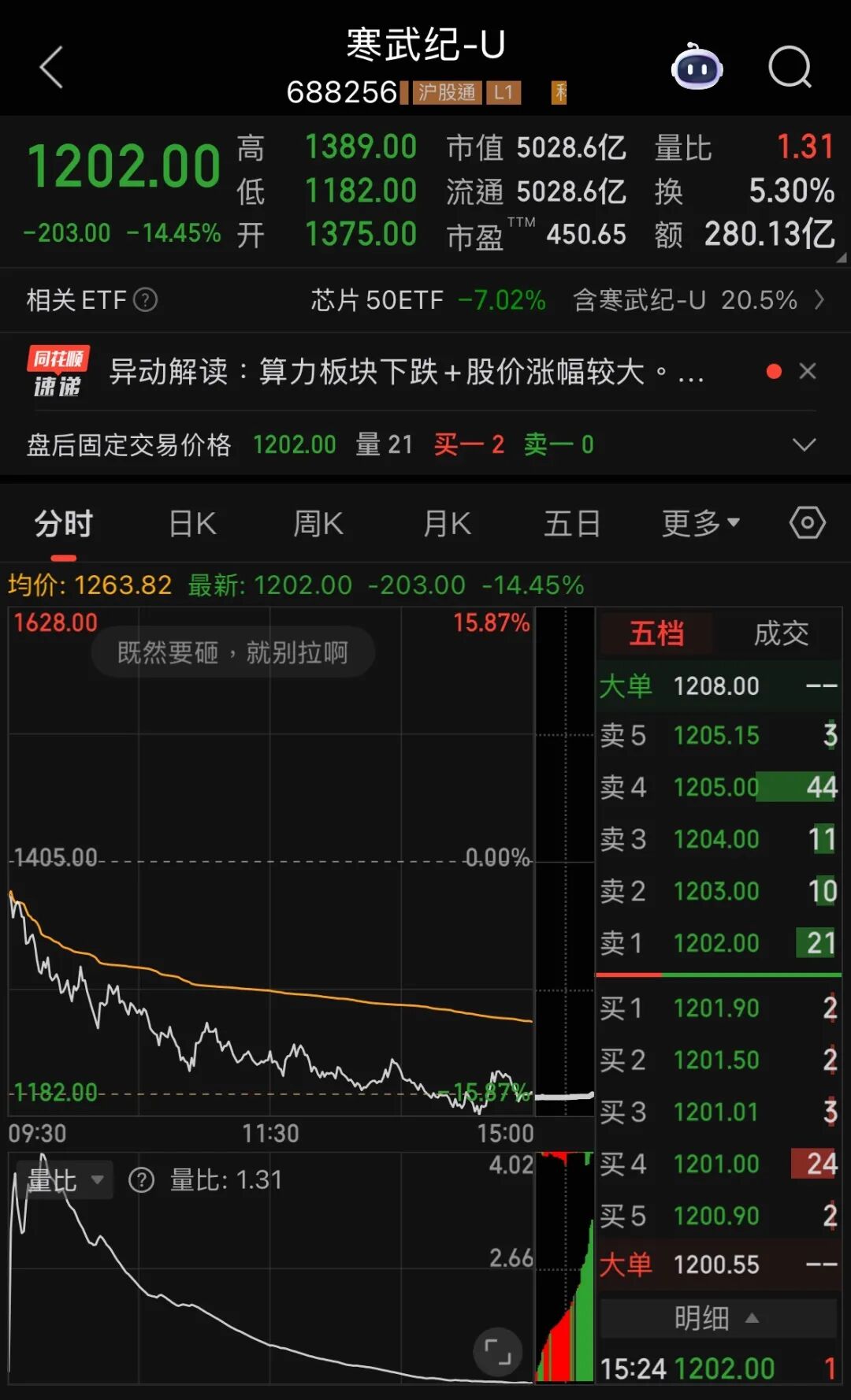 9月4日上午一开盘,A股市场的新晋“股王”寒武纪(688256.SH)股价急速下挫,截至下午收盘,该股跌幅为14.45%,报1202元/股,市值为5028.6亿元。