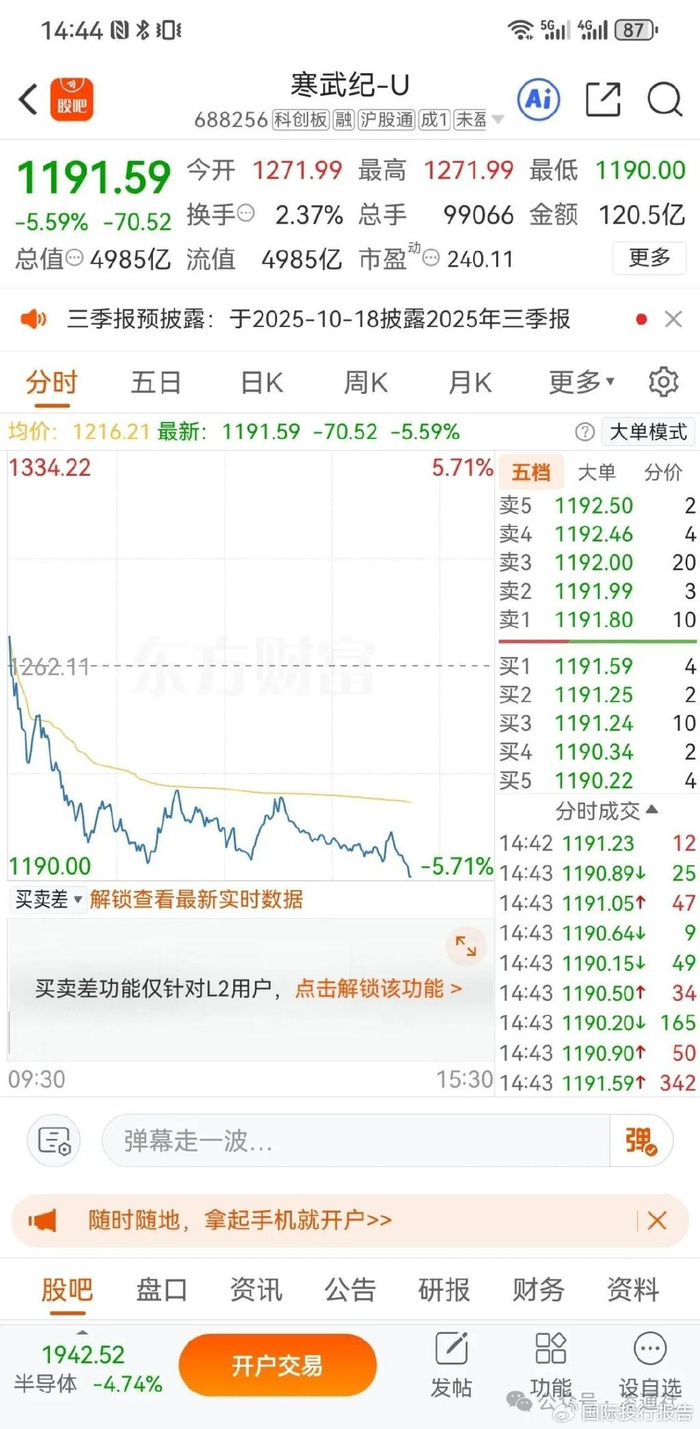 寒武纪盘中跌破发行价,基民成为接盘侠