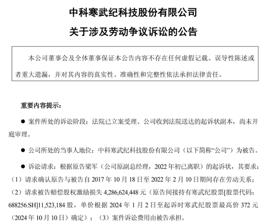 近日,寒武纪发布公告称,公司收到原副总经理兼首席技术官梁军提起的劳动争议诉讼,索赔金额高达42.87亿元。这一数字,甚至超过了寒武纪今年前三季度的全部净利润。