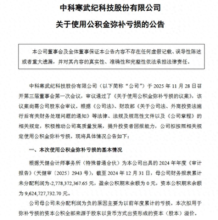 公告显示,寒武纪于2025年11月28日、2025年12月15日分别召开第三届董事会第一次会议、2025年第二次临时股东会,审议通过了《关于使用公积金弥补亏损的议案》。