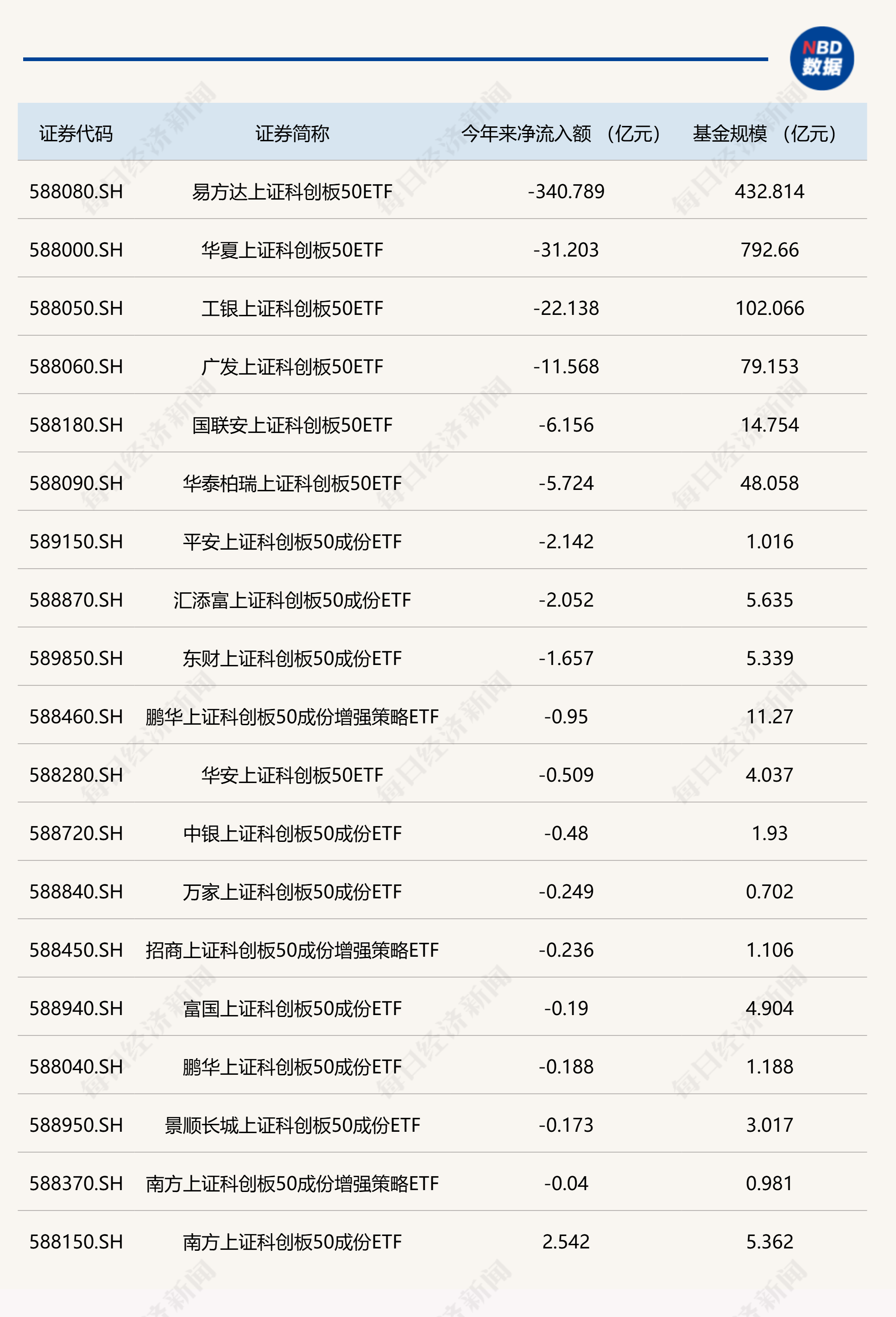 其中,易方达上证科创板50ETF、华夏上证科创板50ETF、工银上证科创板50ETF今年分别净流出340.79亿元、31.2亿元、22.14亿元。
