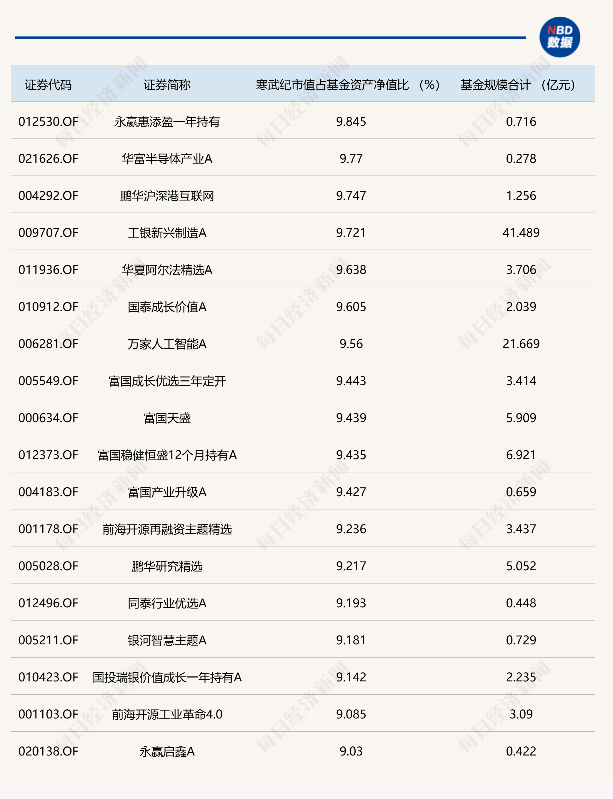 此外,Wind数据统计显示,截至去年末, 第一重仓股为寒武纪、市值占基金资产净值比超9%的主动权益基金有18只(统计主代码)。其中,工银新兴制造规模超40亿元,万家人工智能规模超20亿元,其余多数规模在5亿元以下。