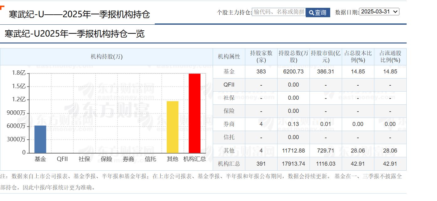 东方财富Choice金融终端数据显示,2025年一季度末,共有383家基金持有寒武纪6200.73万股,占流通股比例14.85%。