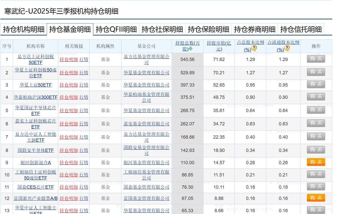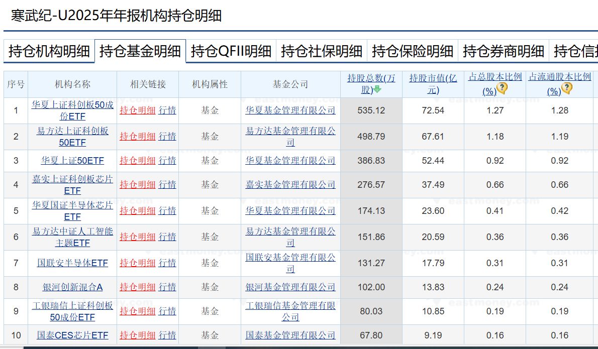 2025年三季报时,易方达上证50科创板ETF持有寒武纪数量超过500万股,而2025年第四季度,减持了41.77万股。另外华泰柏瑞沪深300ETF原本持有寒武纪375.51万股,到第四季度末已退出前十大持仓名单。