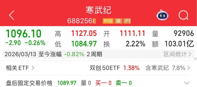 3月13日,也就是财报发布后的首个交易日,寒武纪股价小幅高开后便回落,截至收盘,股价硬是下跌0.26%至1096.10元/股。